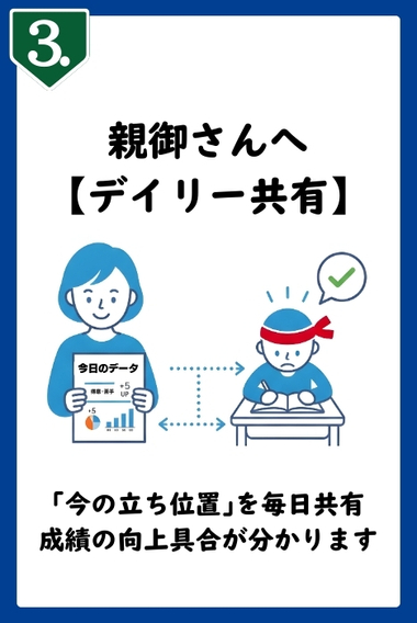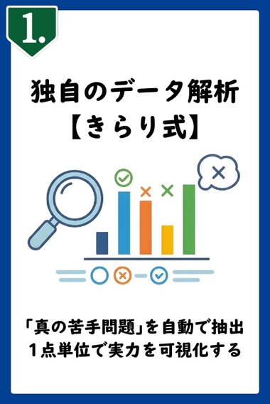 根拠のない「頑張れ」は不要です。過去問と最新の受験データから、合格に必要な点数まであと何点かを1点単位で可視化。高校受験からその先の大学受験まで通用する「戦略的思考」を育みます。